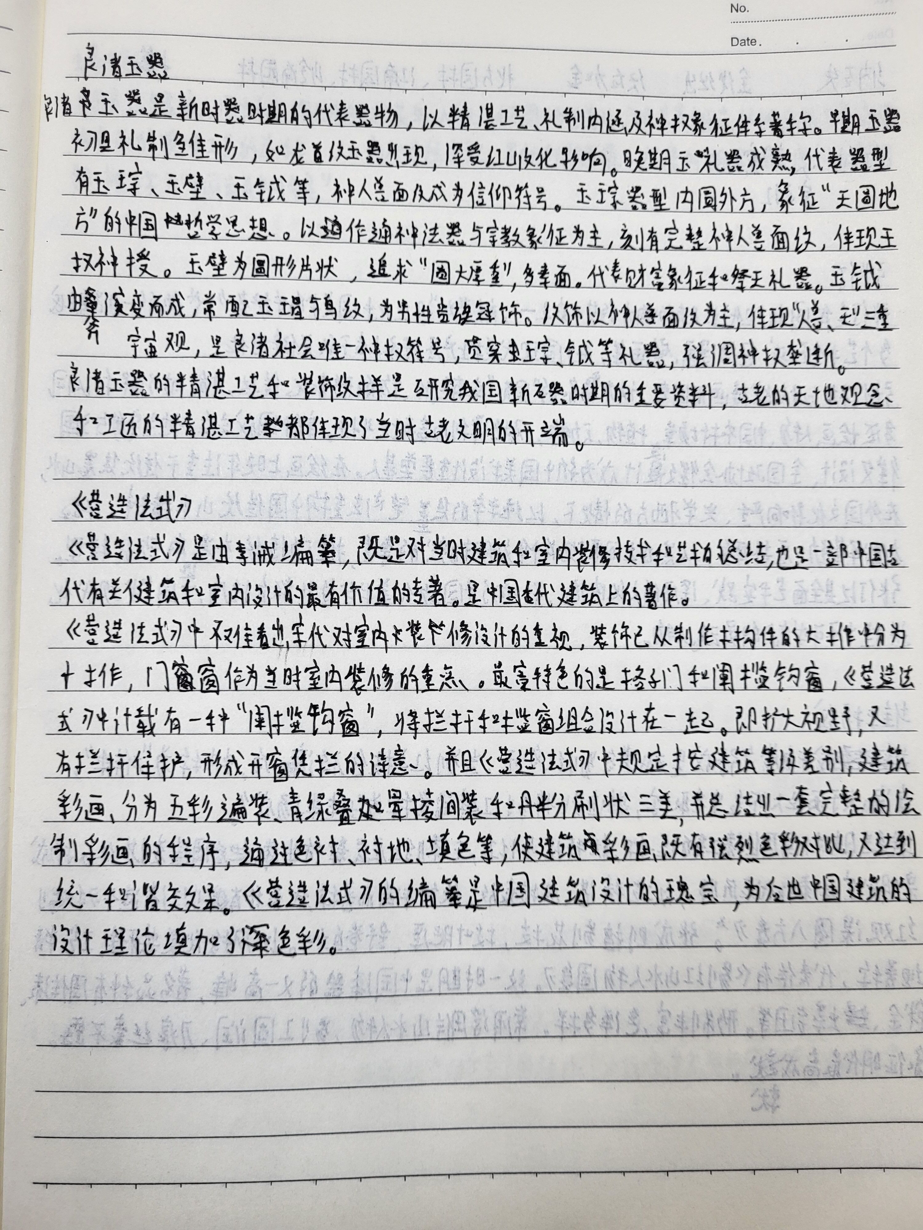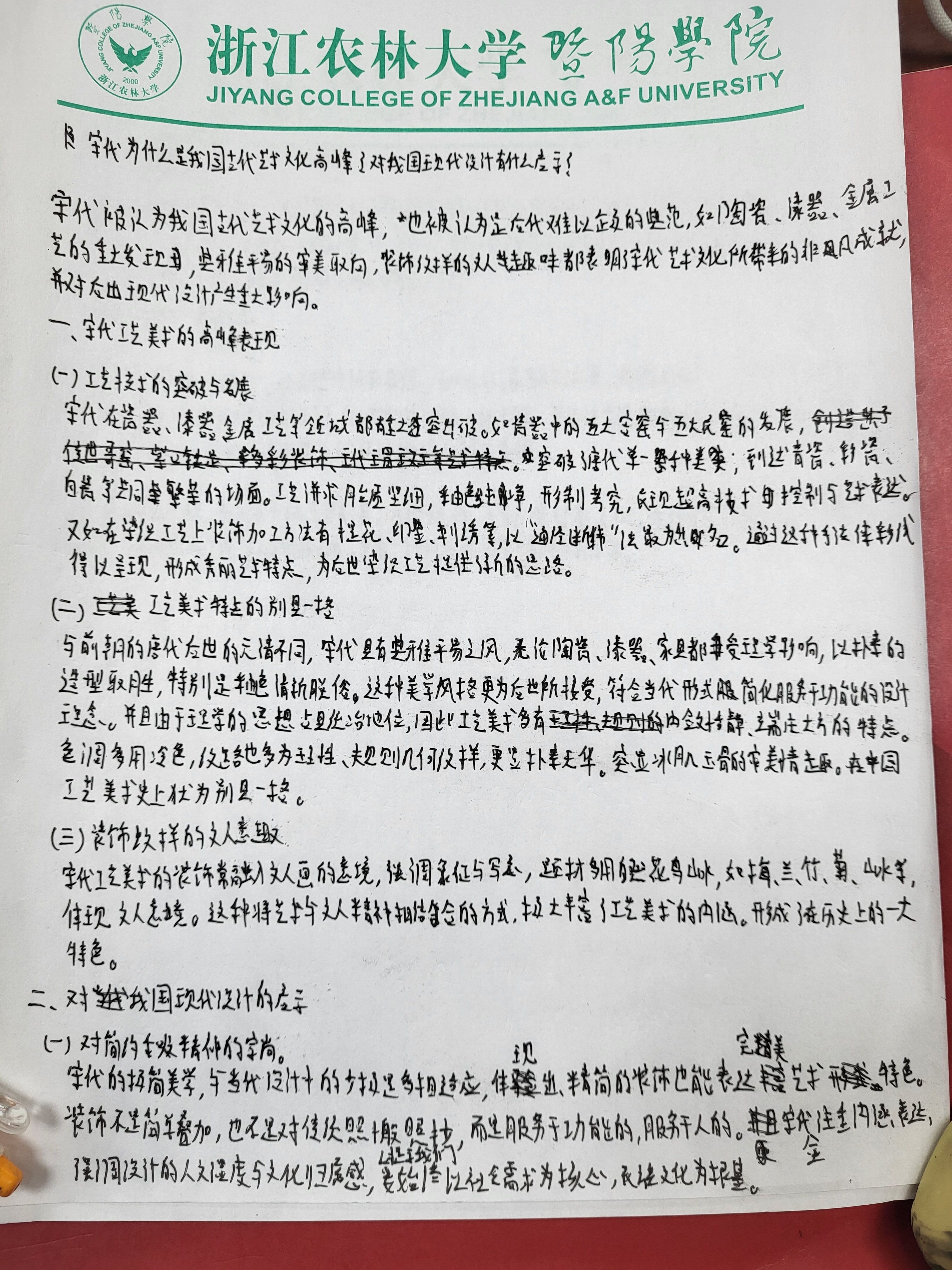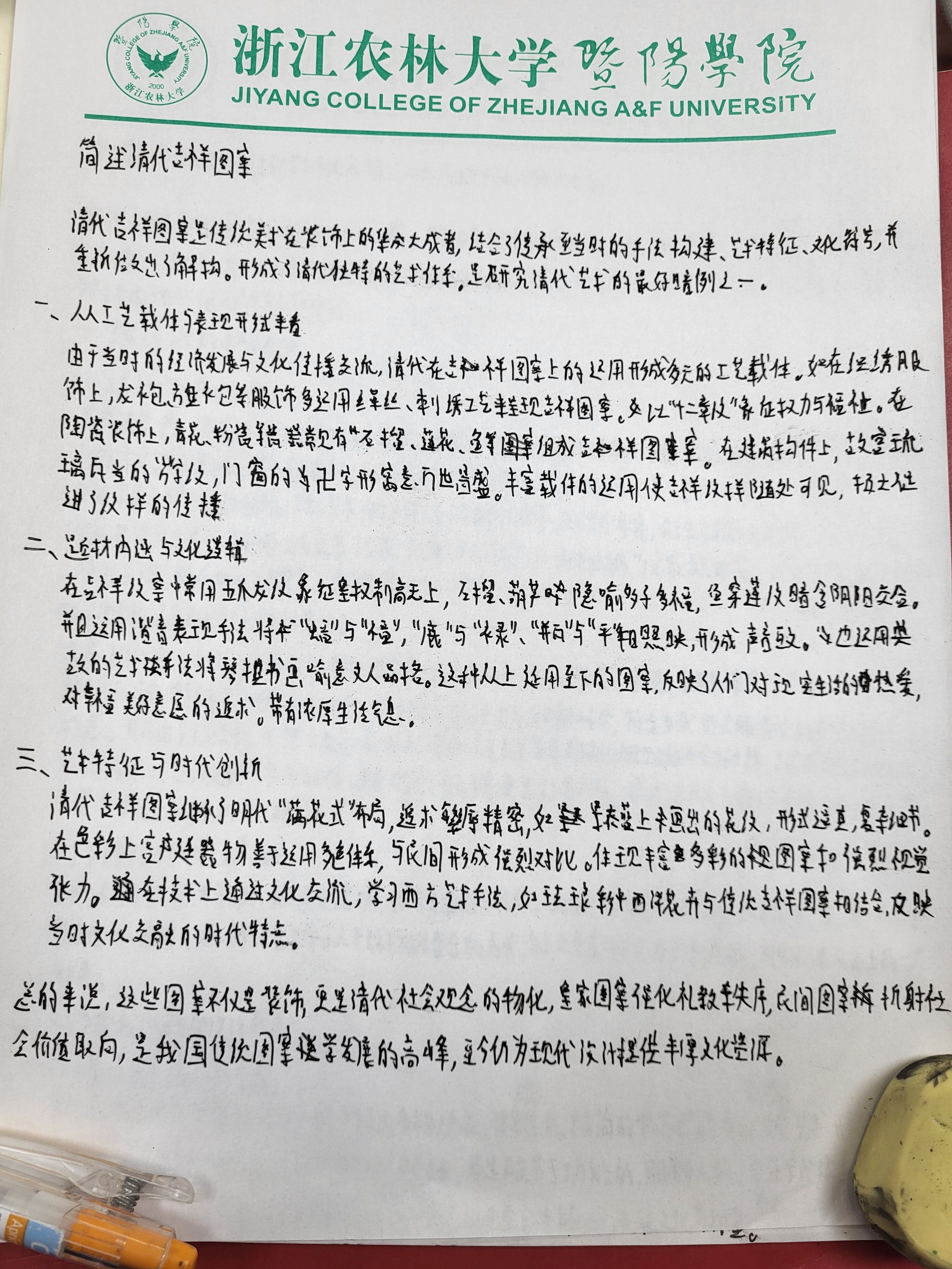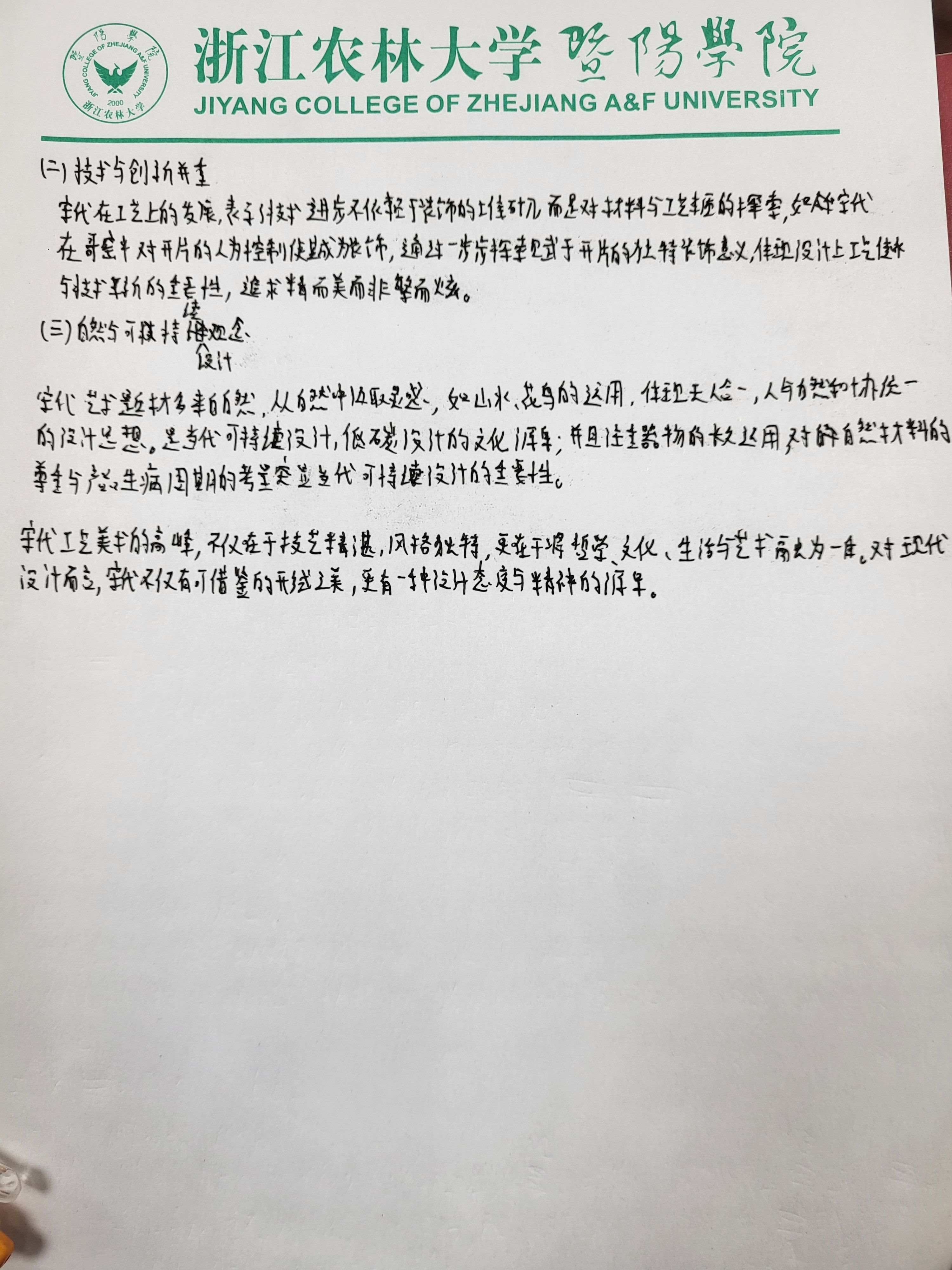of N 浙江农林大学暨阳学院 2000 浙江农林火 JIYANG COLLEGE OF ZHEJIANG A8F UNIVERSITY (二)技术与创新并重 宋代在工艺上的发展,表示技术进步不依赖于装饰的堆砌刀,而是对材料与工艺本质的探索,如字代 在哥空中对开片的人为控制使其成为装饰,通过一步步挥款赋于开片的独特发饰意义,体现设计上工艺传承 与技术革新的重要性,追求精而美而非繁而炫。 绩 (三)自然与可持观念 设计 宋代艺术题材多来自自然,从自然中汲取灵惑,如山水、花鸟的运用,体现天人合一,人与自然和协统一 的设计思想。是当代可持续设计,低碳设计的文化源泉;并且注重器物的长久运用,对自然材料的 尊重与产品生病周期的考呈突显当代可持续设计的重要性。 宋代工艺美术的高峰,不仅在于技艺精湛,风格独特,更在于将哲学、文化、生活与艺术融为一体,对现代 设计而言,守代不仅有可借鉴的形式之美,更有一种设计态度与精神的源。 OFZH 2 2000 浙江农林大学暨 阳学院 浙江农林大学 JIYANG COLLEGE OF ZHEJIANG A8F UNIVERSITY 简述清代吉祥图案 时代吕祥图案是传统美术在装饰上的华校大成者,结合了传承至当时的手法构建、特征、文化符号,并 重新做出了解构。形成了清代独特的艺术体系,是研究清代艺术的最好暗例之一。 一、从工艺载体与表现形式看 由于当时的经济发展与文化传播交流,请代在吉祥图案上的运用形成多元的工艺载体。如在织绣服 巾上,龙袍、旗包采服饰多运用绳丝、刺绣工艺来呈现吉祥图案。以“十二章及”象征权力与福祉。在 陶资装饰上,青花、粉瓷导错器常见有石榴、莲花、鲜组成吉祥图室在建筑构件上,故宫琉 海风当的游级,门窗的为孔字形离意万世昌盛。丰富载体的运用使吉祥这样随处可见,极大促 进了纹样的传播 二、题材内涵与文化逻辑 在吉祥纹等中常用五爪龙纹靠征皇权制高无上,石榴、葫芦隐喻多子多福,鱼穿莲及暗含阴阳交合。 开且运用谐音表现手法将“言”与“福”,“鹿”与“录”、“瓶”与“平年日照应,形成声音致。“也运用其 的艺术手法将琴书画喻意文人品格。这种从上延用至下的图案,反映了人们对现实生活的热爱, 对幸福美好意愿的追求。带有浓厚生活气息。 三、艺术特征与时代创新 清代吉祥图案继承了明代“满花式”布局,追求繁辱精密,如紧太蓝上画出的花纹,形式适直,复杂细节。 在色彩上宫廷器物善于运用多色体系,与民间形成强烈对比。体现丰富多彩的图案和强烈视赏 张力。在技术上通过文化交流,学习西方艺手法,如珐琅彩中西洋花卉与传统专祥图案相结合,反映 当时文化交融的时代特点。 总的来说,这些图案不仅是装饰,更是清代社会观念的物化,皇家图案强化礼教秩序,民间图案折射社 会价值取向,是我国传统图案学发展的高峰,至今仍为现代设计提供丰厚文化资源。 OFZ 2000 浙江农林大学暨阳学院 江农林大学 JIYANG COLLEGE OF ZHEJIANG A8F UNIVERSITY 代为什么是我国古代艺术文化高峰了对我国现代设计有什么启示? 金属 宋代被认为我国古代艺术文化的高峰,也被认为是后代难以企及的典范,如陶瓷、绿器、 就 的重大发现母,些雅平易的审美取向,装饰这样的文人趣味都表明了宋代艺术文化所带来的非A 并对后出现代设计产生重大影响。 一、守代工艺美术的高山峰表现 一)工艺技术的突破与发展 时代在瓷器、漆器金属工艺等领域都有重士突出破。如瓷器中的五大字窑与五大民案的发展, 。突破了唐代单一种类类;到达青瓷、新瓷、 暗等共同繁荣的场面。工艺讲求胎质坚细,轴色纯净,形制考究,表现超高技术控制与艺术表达。 又如在染织工艺上装饰加工方法有提花、印签、刺诱等,以“通径断纬”法最为出名。通过这种手法律形式 得以呈现,形成秀丽艺术特点,为后世纪工艺提供了新的思路。 二)工艺美术特点的别是一格 与前朝的唐代后世的元清不同,宋代具有典雅平易之风,无论陶瓷、漆器、家具都受理学影响,以朴素的 型取胜,特别是半轴色清新脱俗。这种美学风格更为后世所接受,符合当代形式简化服务于功能的设计 理念。并且由于理学的思想占是统治地位,因此工艺美术多有内金文恬静、端庄土方的特点 调多用冷色,纹路也多为性、规则几何这样,更竖扑素天华。突显冰肌玉骨的审美情趣。在中国 工艺美术史上犹为别是一格。 三)装饰玖样的文人类趣 宋代工艺美术的装饰常融入文人画的意境,强调象征与写志,题材多用自然花鸟山水,如梅、兰、竹、菊、山水等, 体现文人意境。这种将艺术与文人精神相结合的方式,极大丰富了工艺美术的内涵。形成了在历史上的一大 特色。 二、对我国现代设计的启示 (一)对简约和极精神的宗尚。 现 完美 宋代的极简美学,与当代设计的少极是多相适应,体验出精简的装饰也能表达个艺术开特色。 装饰不是简单餐加,也不是对传统照搬照抄,而是服务于功能的,服务干人的。且宋代注重内涵表达, 北我 强调设计的人文湿度与文化归属感,姜始终以社会需求为核心,民族文化为根基。 更金 No. Date, 晨诸玉器 dy 储玉知是新时器时期的代表器物,以精湛工艺、礼制内涵及神权象征体系著称。早期玉器 初息礼制雏形,如龙首纹玉器出现,深受红山文化影响。晚期玉礼器成熟,代表器型 有玉王琮、玉壁、玉钺等,神人兽面及成为信仰符号。玉琮器型内圆外方,象征“王圆地 方”的中国哲学思