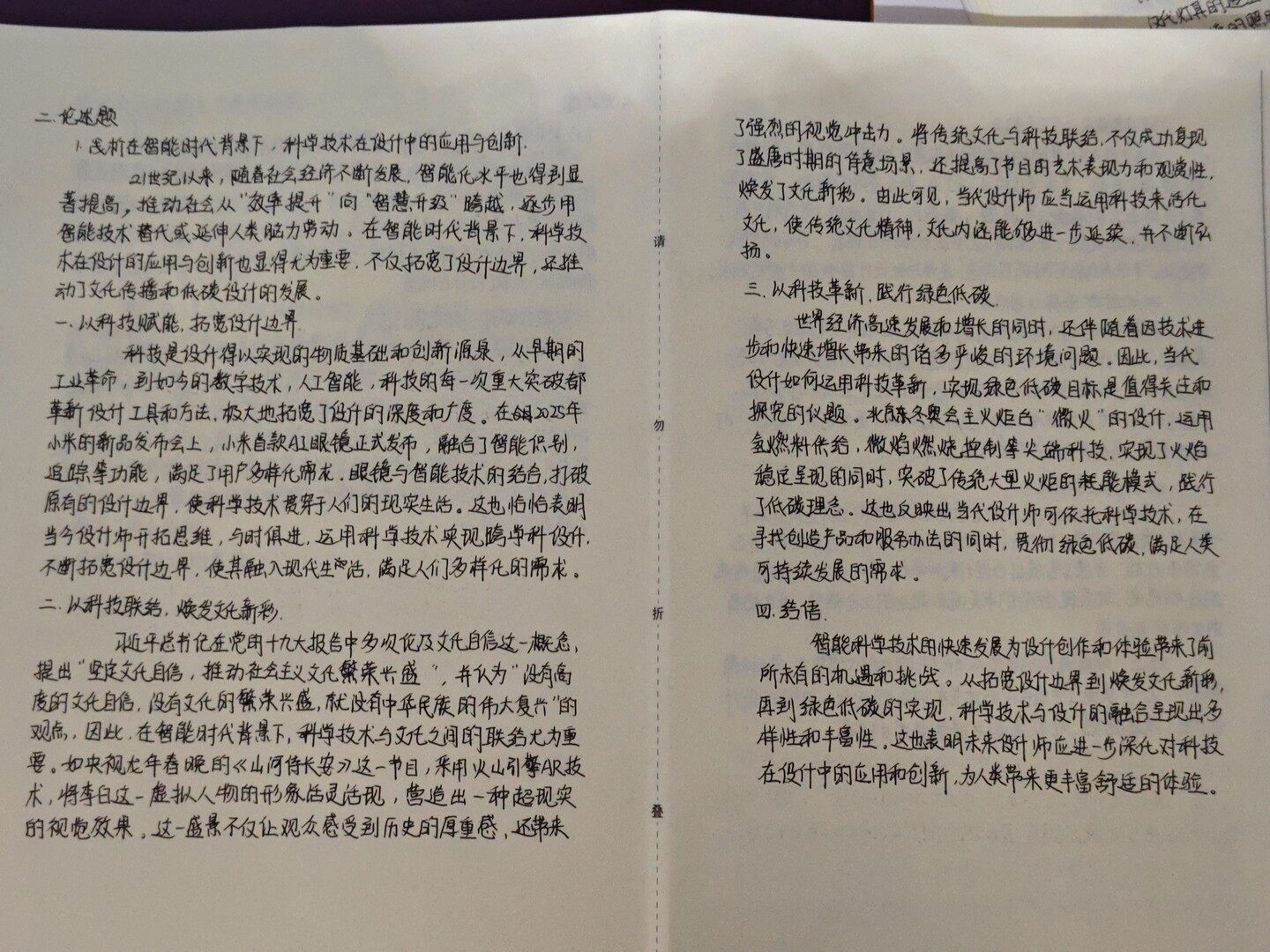 代灯具的 的照 二、论述题 浅析在智能时代背景下,科学技术在设计中的应用与创新. 了强烈的视觉冲击力。将传统文化与科技联结,不仅成功复现 21世纪以来,随着社会经济不断发展,智能化水平也得到显 了盛唐时期的侍意场景,还提高了节目的艺术表现力和观赏性, 著提高,推动社会从“效率提升”向“智慧升级”跨越,逐步用 焕发了文化新彩。由此可见,当代设什师应当运用科技来活化 智能技术替代或延伸人类脑力劳动。在智能时代背景下,科学技 请 文化,使传统文化精神,文化内涵能够进一步延续,并不断弘 术在设计的应用与创新也显得尤为重要,不仅拓宽]设计边界,还推 扬。 动了文化传播和低碳设计的发展。 三、以科技革新,践行绿色低碳 一、以科技赋能,拓宽设什边界 世界经济高速发展和增长的同时,还伴随着因技术进 科技是设计得以实现的物质基础和创新源泉,从早期的 少和快速增长带来的诸多严峻的环境问题。因此,当代 工业革命,到如今的数字技术,人工智能,科技的每一次重大突破都 设计如何运用科技革新,实现绿色低碳目标是值得关注和 革新设计工具和方法,极大地拓宽了设计的深度和广度。在2025年 勿 探究的议题。北京东冬奥会主火炬台“微火”的设计,运用 小米的新品发布会上,小米首款AI眼镜正式发布,融合了智能识别, 氢燃料供给,微焰燃烧控制等尖端科技、实现了火焰 追踪等功能,满足了用户多样化需求。眼镜与智能技术的结合,打破 稳定呈现的同时,突破了传统大型火炬的耗能模式,践行 原有的设计边界,使科学技术贯穿于人们的现实生活。这也恰恰表明 了低碳理念。这也反映出当代设计师可依托科学技术,在 当今设计师开拓思维,与时俱进,运用科学技术实现跨学科设计, 寻找创造产品和服务办法的同时,贯彻绿色低碳,满足人类 不断拓宽设什边界,使其融入现代生活,满足人们多样化的需求。 可持续发展的需求。 二、以科技联结,焕发文化新彩. 折 四.结语. 习近平总书记在党的十九大报告中多次论及文化自信这一概念, 智能科学技术的快速发展为设计创作和体验带来了前 提出“坚定文化自信,推动社会主义文化繁荣兴盛”,并认为“没有高 所未有的机遇和挑战。从拓宽设什边界到焕发文化新彩, 度的文化自信,没有文化的繁荣兴盛,就没有中华民族的伟大复兴”的 观点,因此,在智能时代背景下,科学技术与文化之间的联结尤为重 样性和丰富性的实现,科学技术与设计的融合呈现出多 。这也 来设什师 步 对科技 要。如央视龙年春晚的《山河侍长安》这一节目,采用火山引擎AR技 在设计中的应用和创新,为人类带来更丰富舒适的体验。 术,将李白这一虚拟人物的形象活灵活现,营造出一种超现实 的视觉效果。这一盛景不仅让观众感受到历史的厚重感,还带来