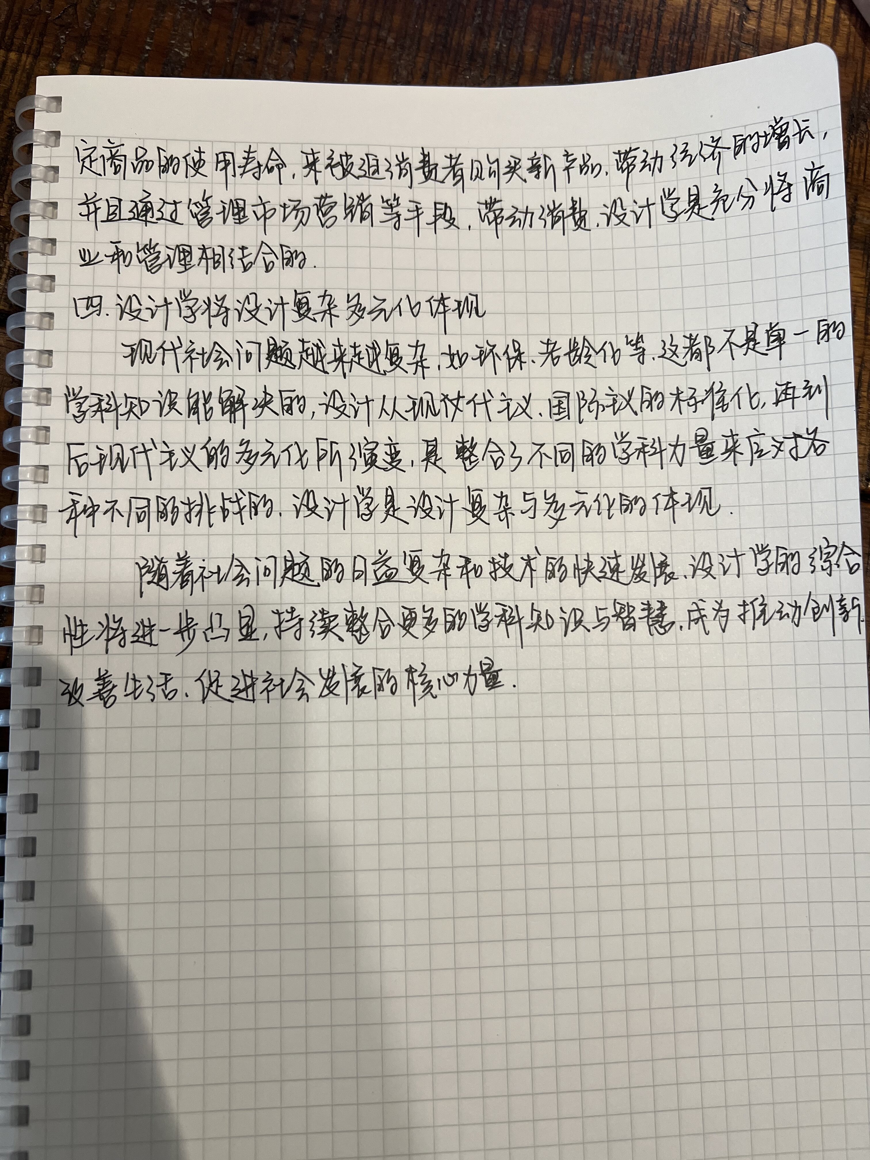 结尾段:历史发展证明设计学在面临各种新的挑战时,其反应并不只是单学科的进行应对而是逐步接受和打破专业领域的壁垒主动学习其他技术的知识体系。设计因此成为了一门复杂的、多元化的综合性学科。
